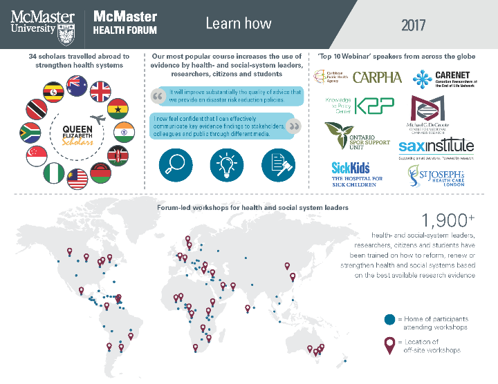 Our programs build on the experience of Forum Director John Lavis in conducting more than 130 training workshops in more than 30 countries with health- and social-system policymakers, stakeholders, citizens, students and researchers drawn from more than 60 countries.